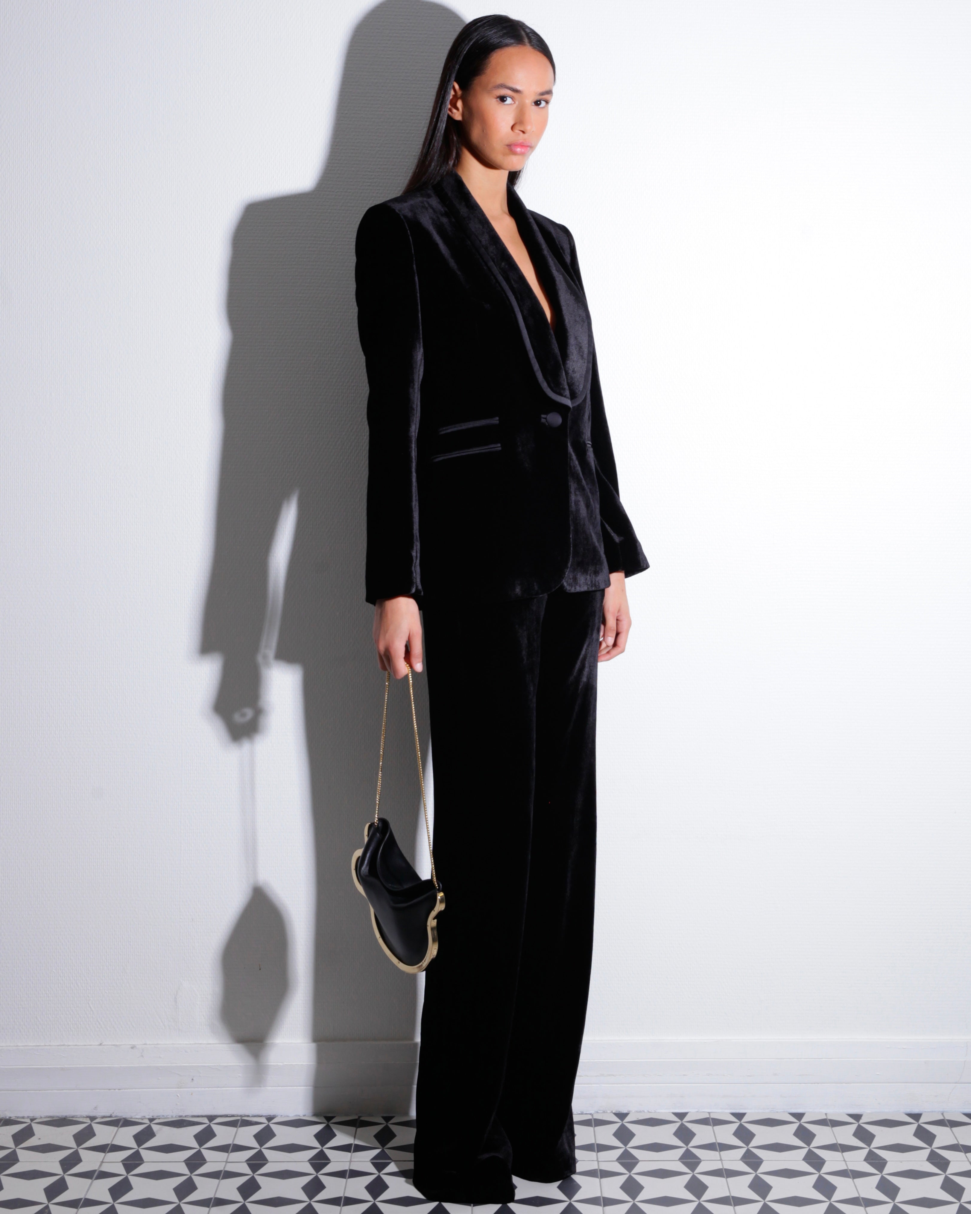 Veste tailleur droite entièrement doublée croisure devant fermée par un bouton, col châle avec empiècement satin, manches montées façon tailleur, deux pinces devant avec poches passepoilées latérales, bas de veste arrondi, fausses fente aux bas de manches fermées par quatre boutons.