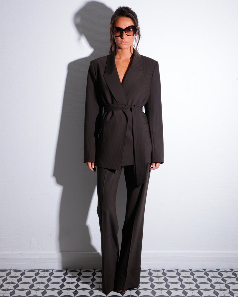 Pantalon large taille haute, large ceinture droite munie de quatres passants, poches italiennes latérales et pinces dos à la taille, pli cassé devant et dos sur toute la longueur de jambe.